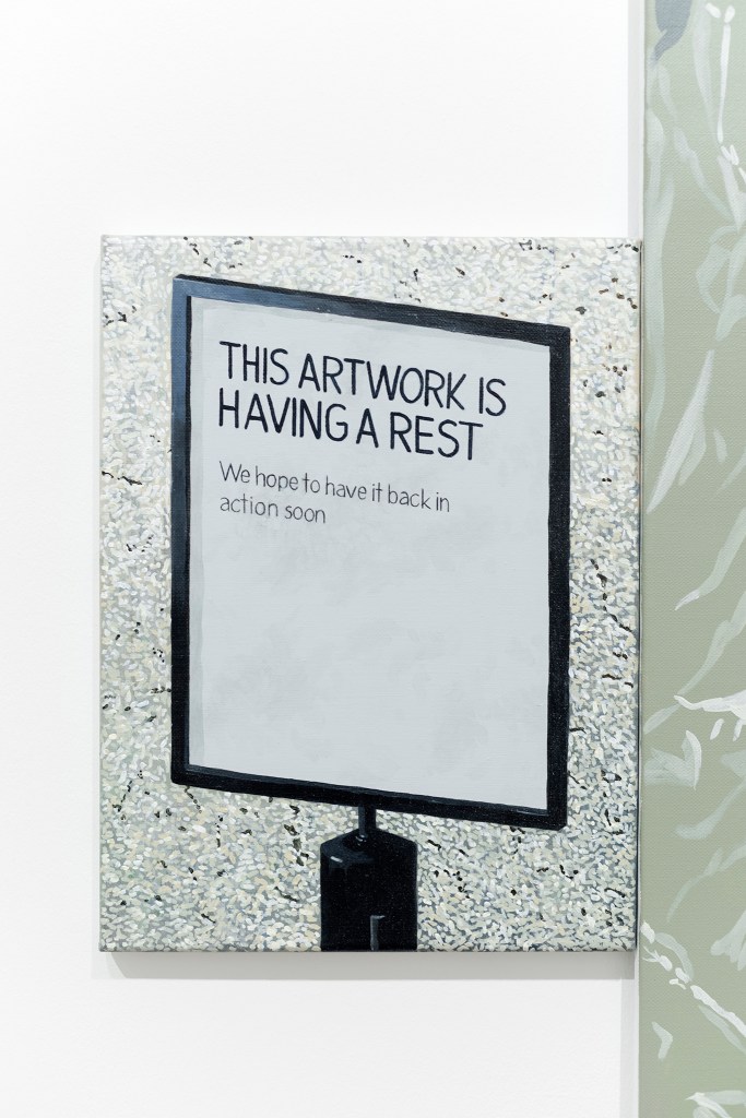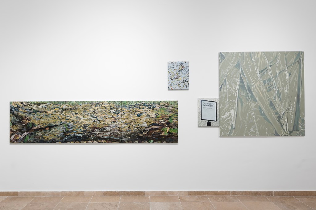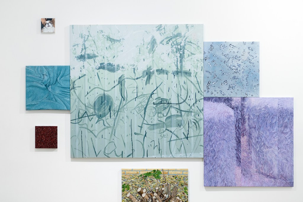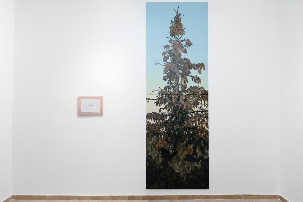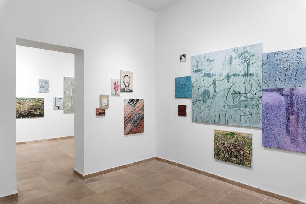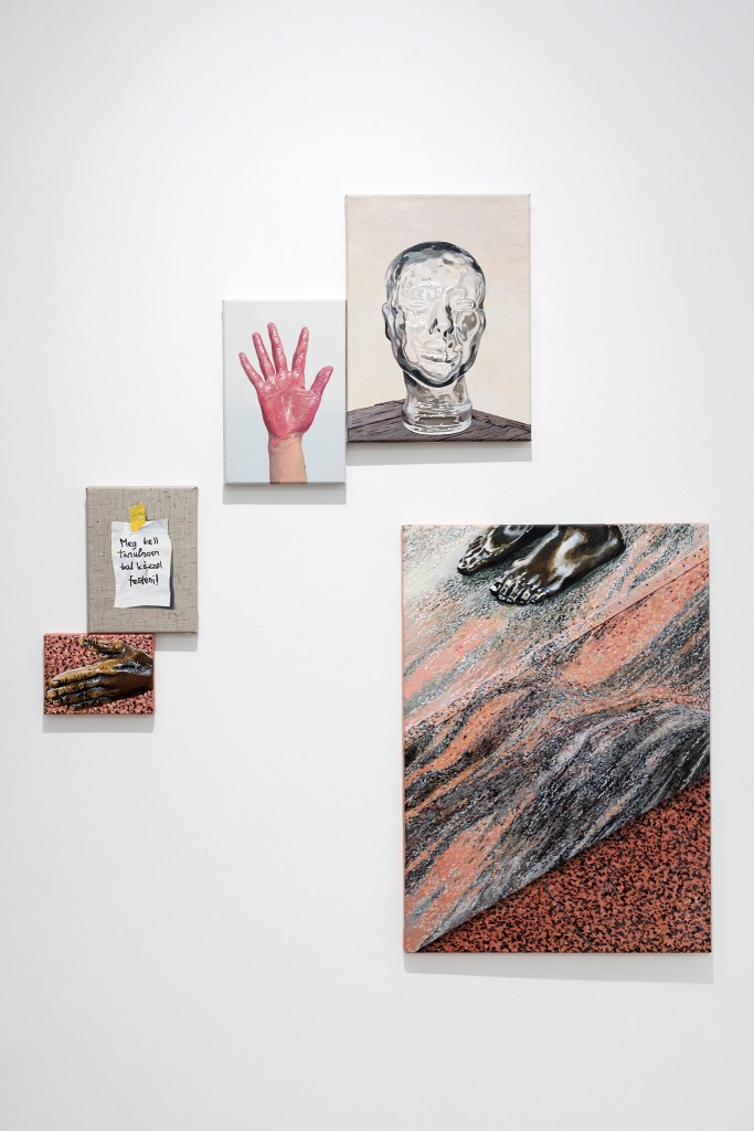With meticulously recorded details wrapped in subtle melancholy and half-smiles, the artist invites the viewer to look closely. On the amnesiac surfaces of the white wall, personal observations meet banal juxtapositions: fragments of advertisements, dramatic hand portraits and loose doodles on droplet-spangled window panes. All this is completed with nature’s sublime majesty, the striking painterliness of tree barks, clouds and pine cones, which – due to the sharp focus delineating vivid tonal and colour values – become still and quiet macrocosms. The ephemeral constellations, which could topple over at any moment, are counterpointed by visions of sculptural transformation: the feet of a bronze figure resting on marble, the enigmatic object of a glass mask or a museum plaque informing us of the temporary absence of an artwork. Lyrical narratives outline non-linear paths here.