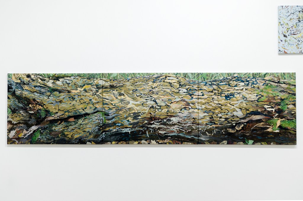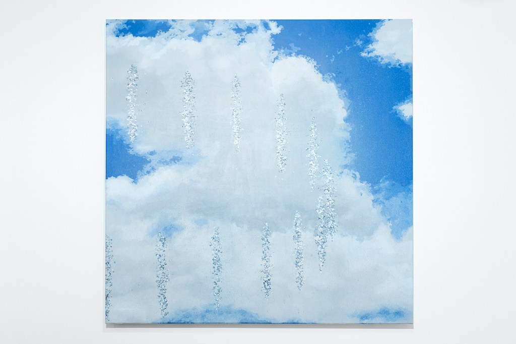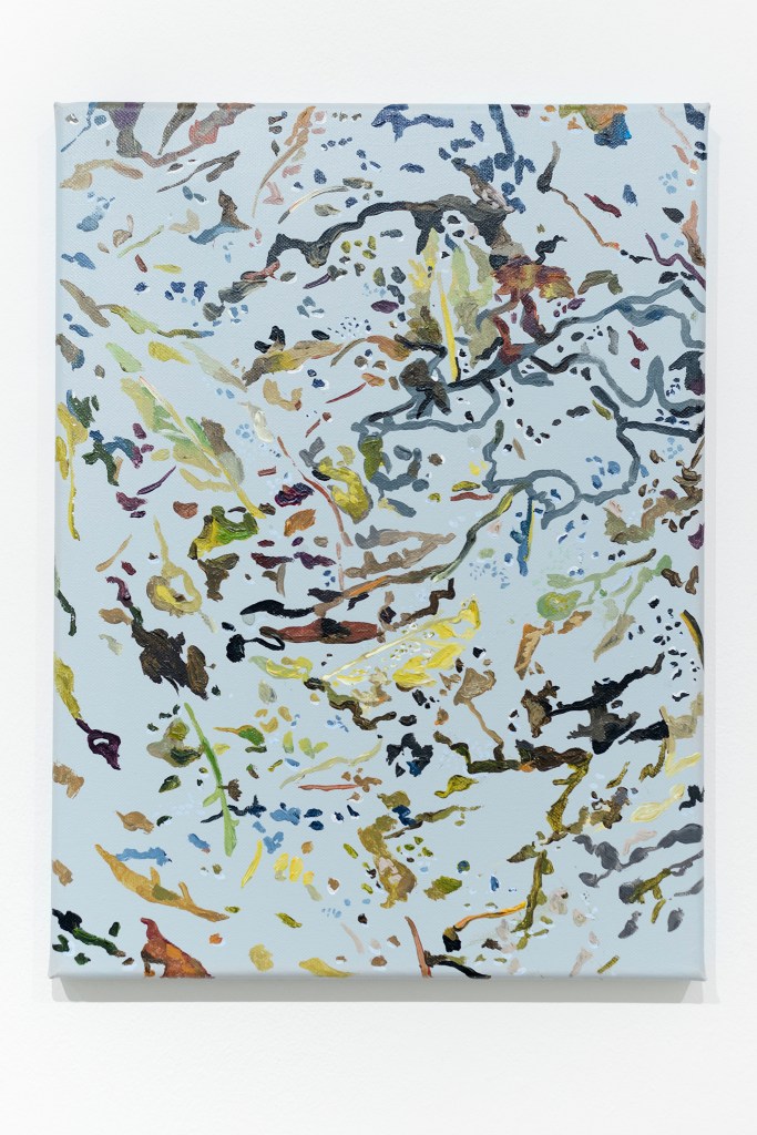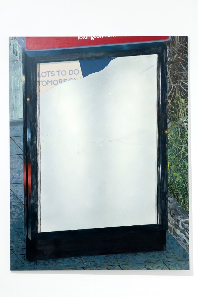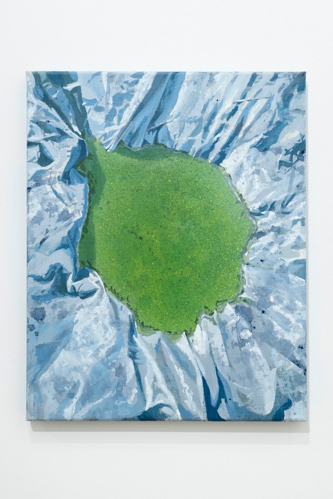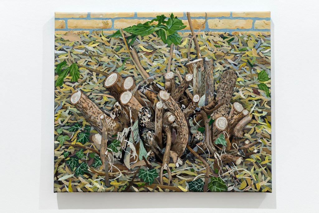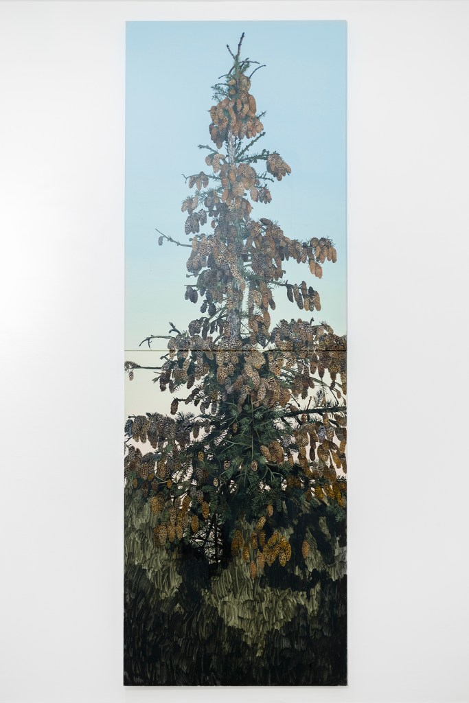 With meticulously recorded details wrapped in subtle melancholy and half-smiles, the artist invites the viewer to look closely. On the amnesiac surfaces of the white wall, personal observations meet banal juxtapositions: fragments of advertisements, dramatic hand portraits and loose doodles on droplet-spangled window panes. All this is completed with nature’s sublime majesty, the striking painterliness of tree barks, clouds and pine cones, which – due to the sharp focus delineating vivid tonal and colour values – become still and quiet macrocosms. The ephemeral constellations, which could topple over at any moment, are counterpointed by visions of sculptural transformation: the feet of a bronze figure resting on marble, the enigmatic object of a glass mask or a museum plaque informing us of the temporary absence of an artwork. Lyrical narratives outline non-linear paths here.